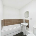 White suite comprising of panel bath with chrome taps over. Wash hand basin with chrome mixer taps. WC with low level flush. Extractor fan. Tiled splash areas and tiled effect flooring. Central heated chrome towel rail.