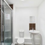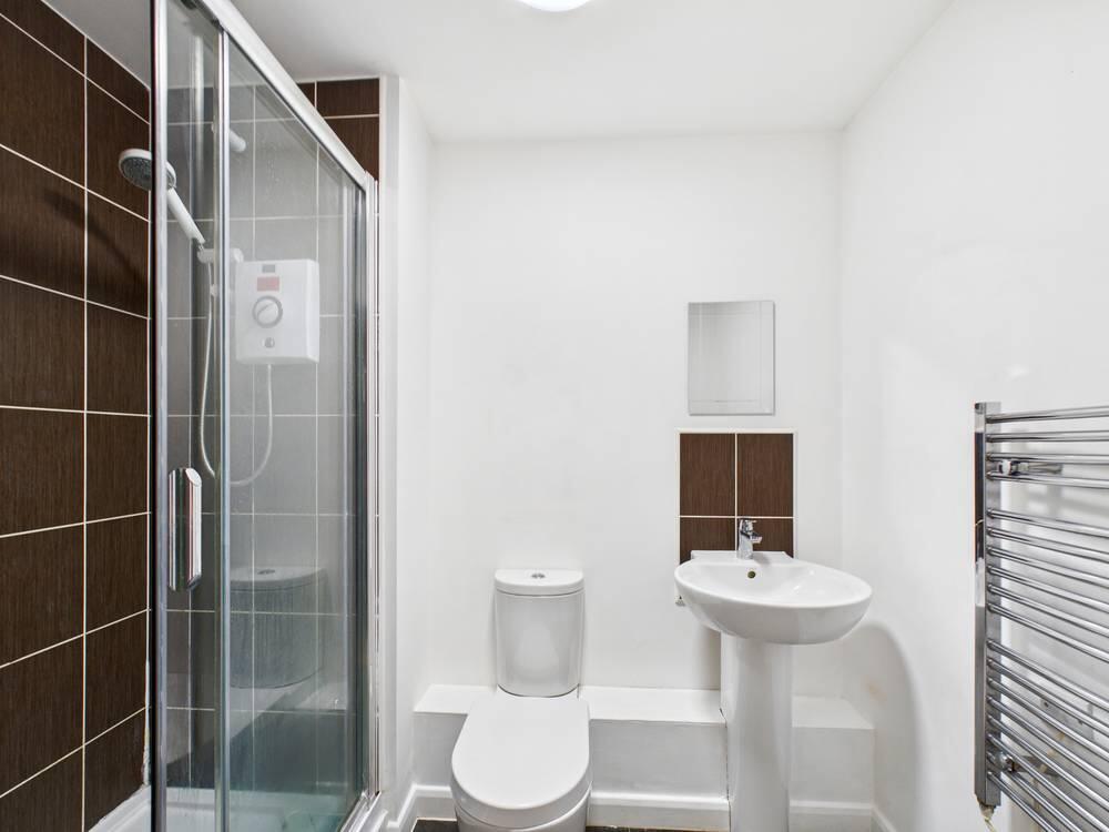 White suite comprising of shower cubicle with electric shower. WC with low level flush. Wash hand basin with chrome mixer tap. Extractor fan. Central heated chrome towel rail. Tiled splash areas and tiled effect flooring.
