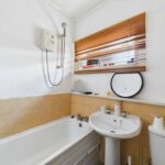 White suite comprising of WC with low level flush. Wash hand basin with chrome taps over. Panel bath with chrome taps and electric shower above. Tiled effect flooring. UPVC double glazed frosted window to the rear elevation.
