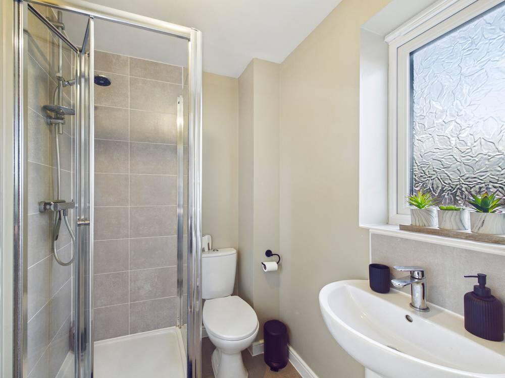 White suite comprising of shower cubicle with mains feed shower. WC with low level flush. Wash hand basin with chrome mixer tap. Extractor fan. Tiled effect flooring. Central heated radiator. UPVC double glazed frosted window to the rear.