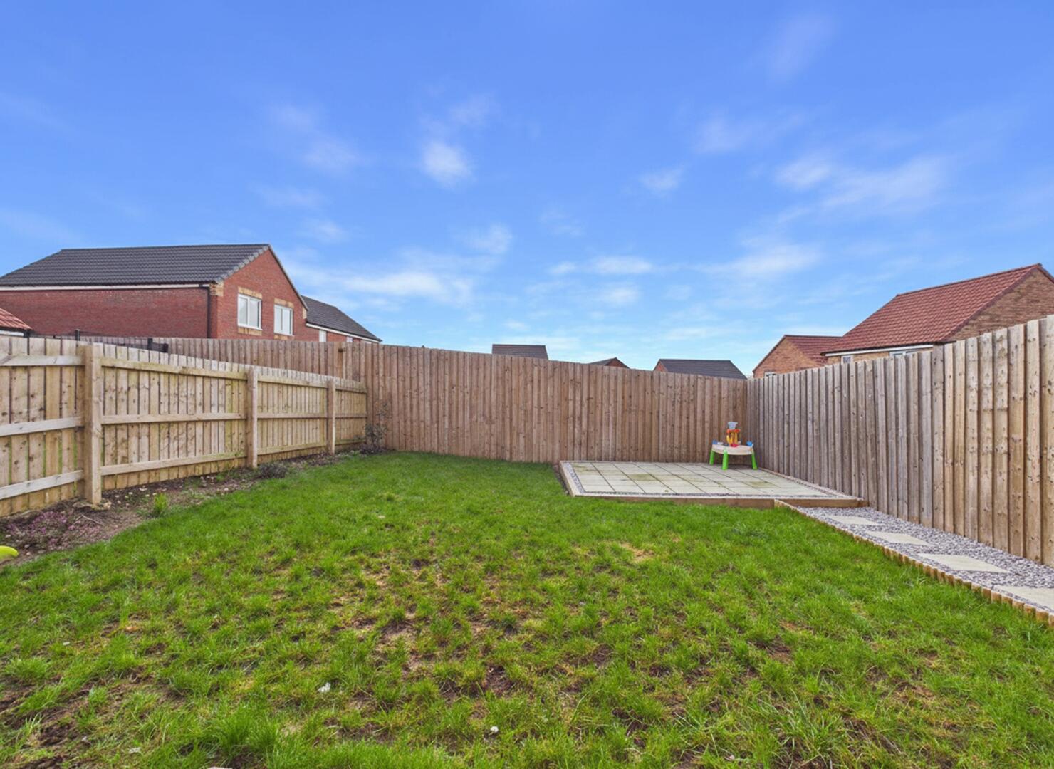 To the rear, the property enjoys a fully enclosed garden, mainly laid to lawn, creating a great space for families, outdoor entertaining, or relaxing. A paved patio area sits directly outside the rear doors, ideal for seating and summer dining, while fencing to the boundaries provides privacy and security. There is also useful side access connecting the front and rear of the property.