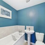 White suite comprising of panel bath with chrome taps. Wash hand basin with chrome mixer tap. WC with low level flush. Extractor fan. Tiled splash areas, tiled effect flooring. Central heated radiator.