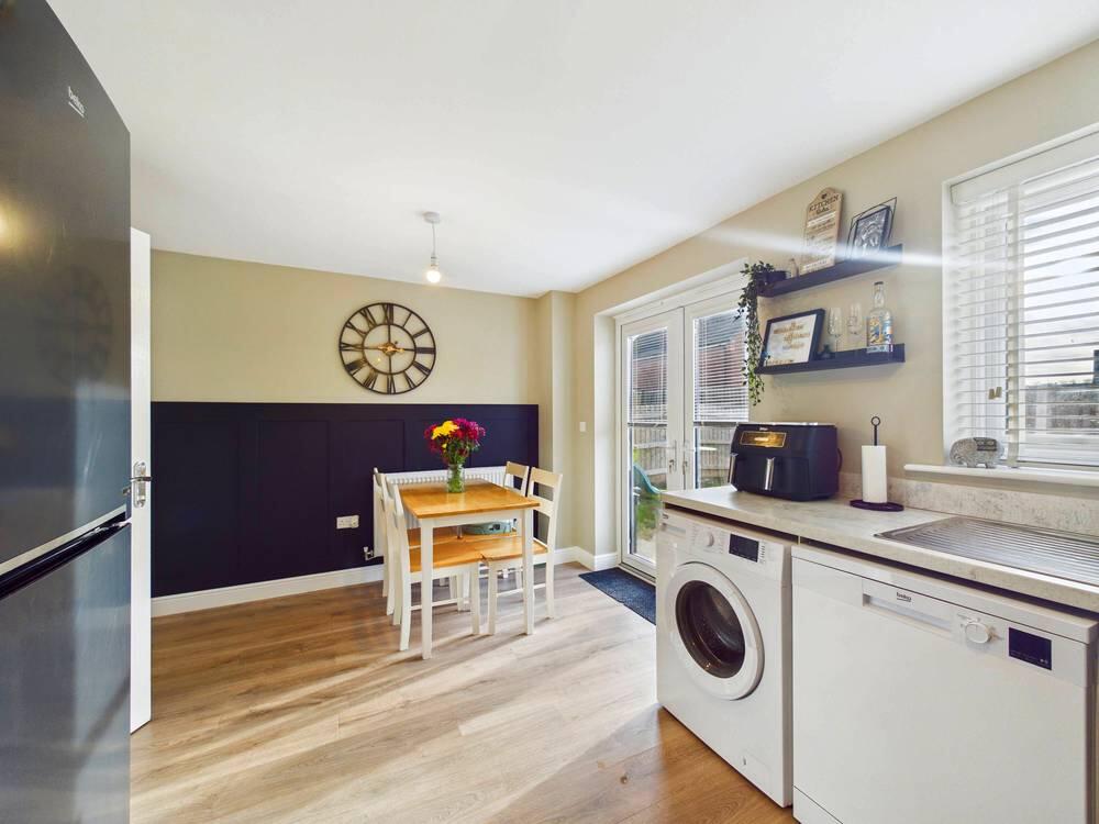 Externally, the property offers an attractive frontage with a lawned garden and a driveway providing off-street parking, which leads to a garage. The home is set within a modern residential development and benefits from a neat and well-presented approach.