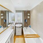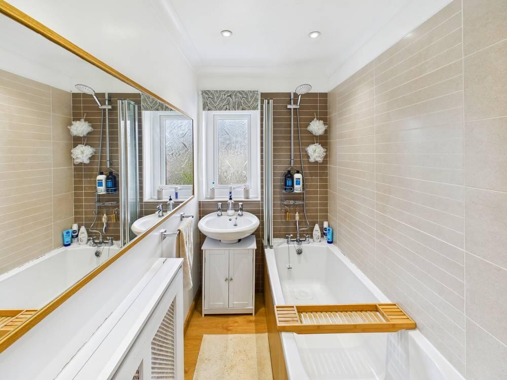 The bathroom offers a clean, modern design with a white bathtub and overhead shower, a white basin set into a vanity unit, and a large mirror above. A window brings in natural light, while neutral tiling completes the fresh look.