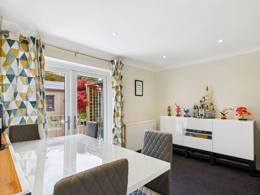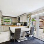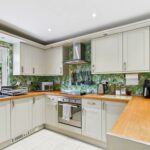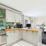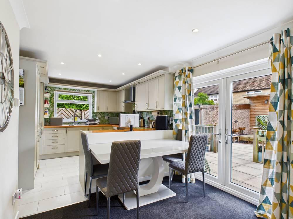 This kitchen features a practical U-shaped layout with cream cabinetry complemented by butcher block-style worktops. Integrated appliances, including an oven and hob, enhance functionality. The room benefits from natural light through a window above the sink and opens into the dining area where there are doors that lead out onto the patio, creating a bright and inviting space for meals and entertaining.
