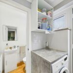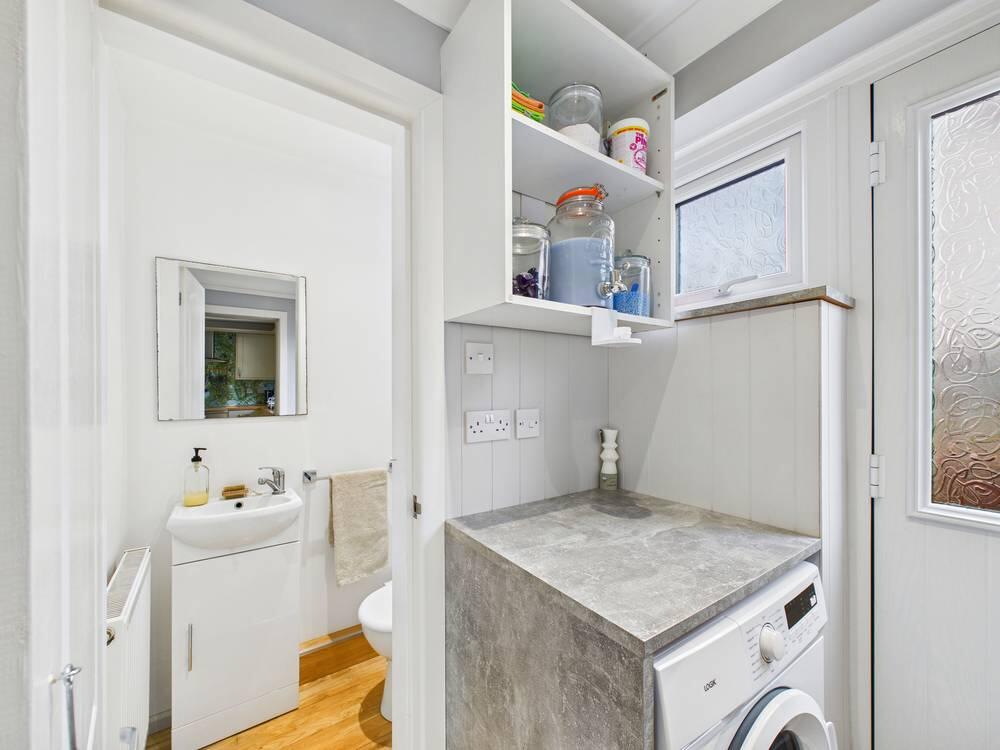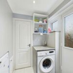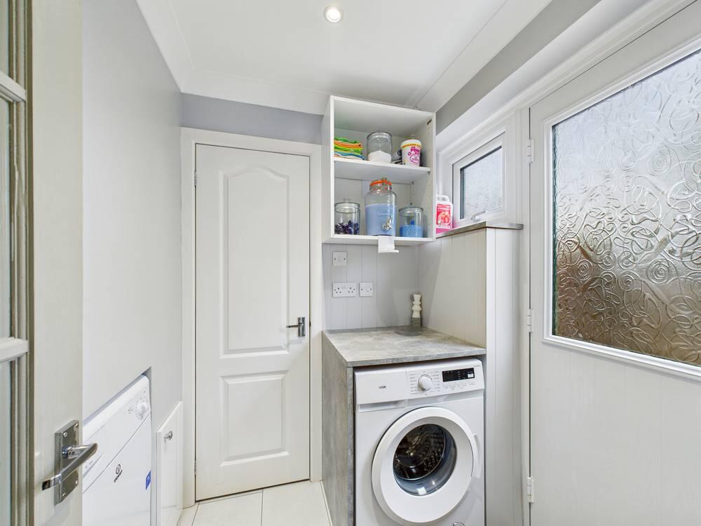 The laundry room is a practical, well-lit space with room to fit a washing machine beneath a countertop with shelves and wall cabinets for storage. A frosted glass door leads outside, providing easy access to the garden area.