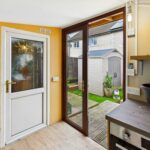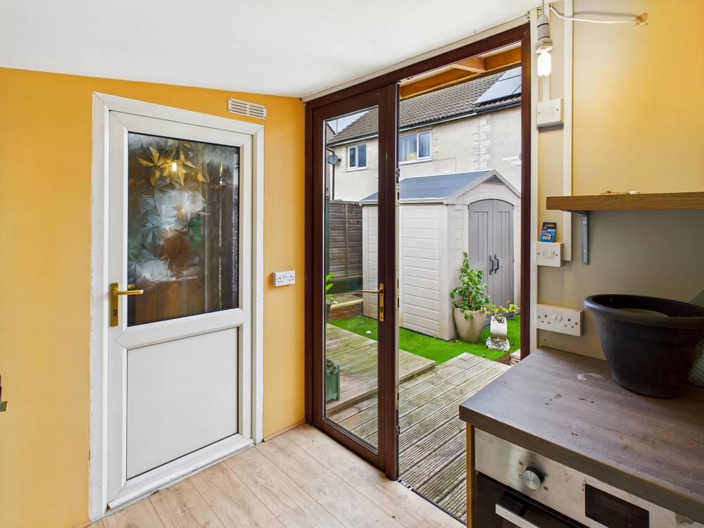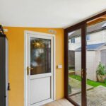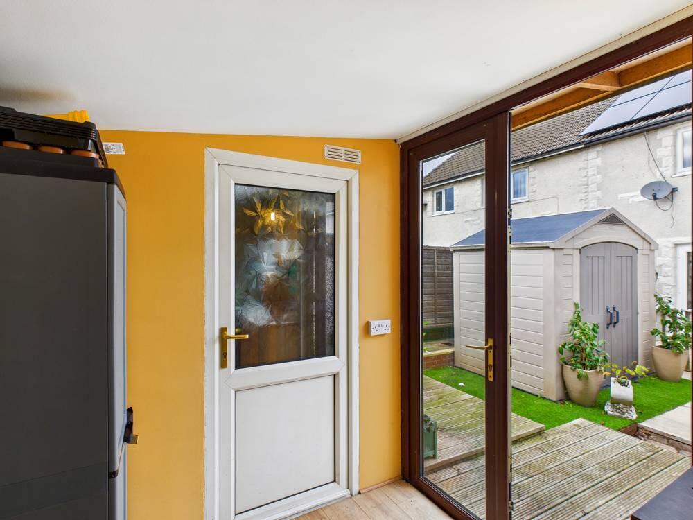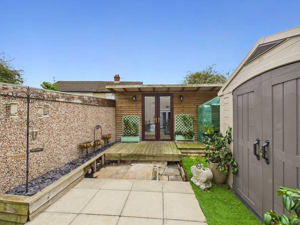 This out-house is a practical additional space in the garden, featuring a door and window to bring in natural light. It offers flexibility for storage or hobbies and connects to an inner room which could serve various purposes depending on needs.