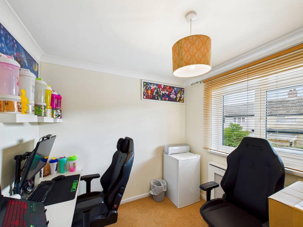 Currently arranged as an office, this room features a window allowing daylight and enough space for two desks or a single bed. Its neutral decor and practical layout make it suitable either as a third bedroom or a dedicated work area.