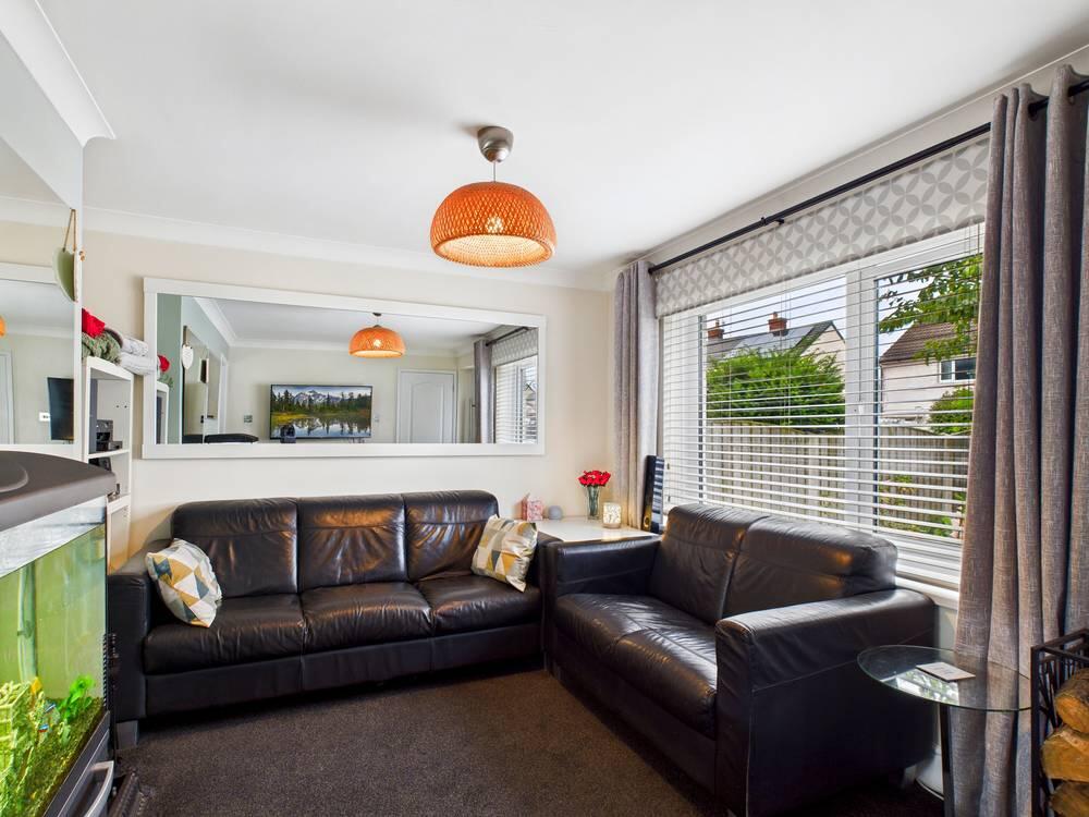 The living room is a cosy yet well-proportioned space featuring a traditional fireplace. A large window allows natural light to fill the room, the neutral decor with dark carpeting creates a comfortable atmosphere for relaxing or entertaining guests.