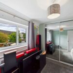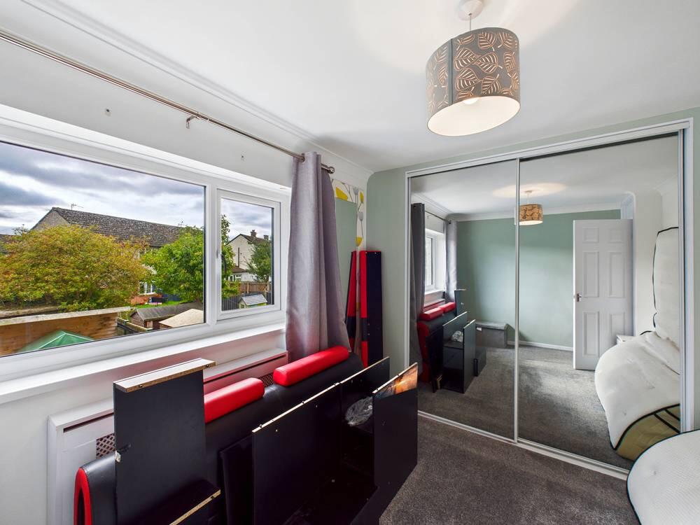 This bedroom is a bright and cosy double room with ample natural light from a large window. It benefits from a fitted wardrobe with mirrored sliding doors and neutral decor, creating a calm and versatile space.