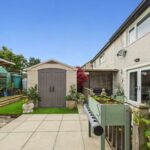 The garden is a well-maintained outdoor space featuring a lawn bordered by flower beds and mature trees, creating a private and tranquil setting. A paved patio area extends from the house, ideal for seating and outdoor dining. The garden also includes a shed.