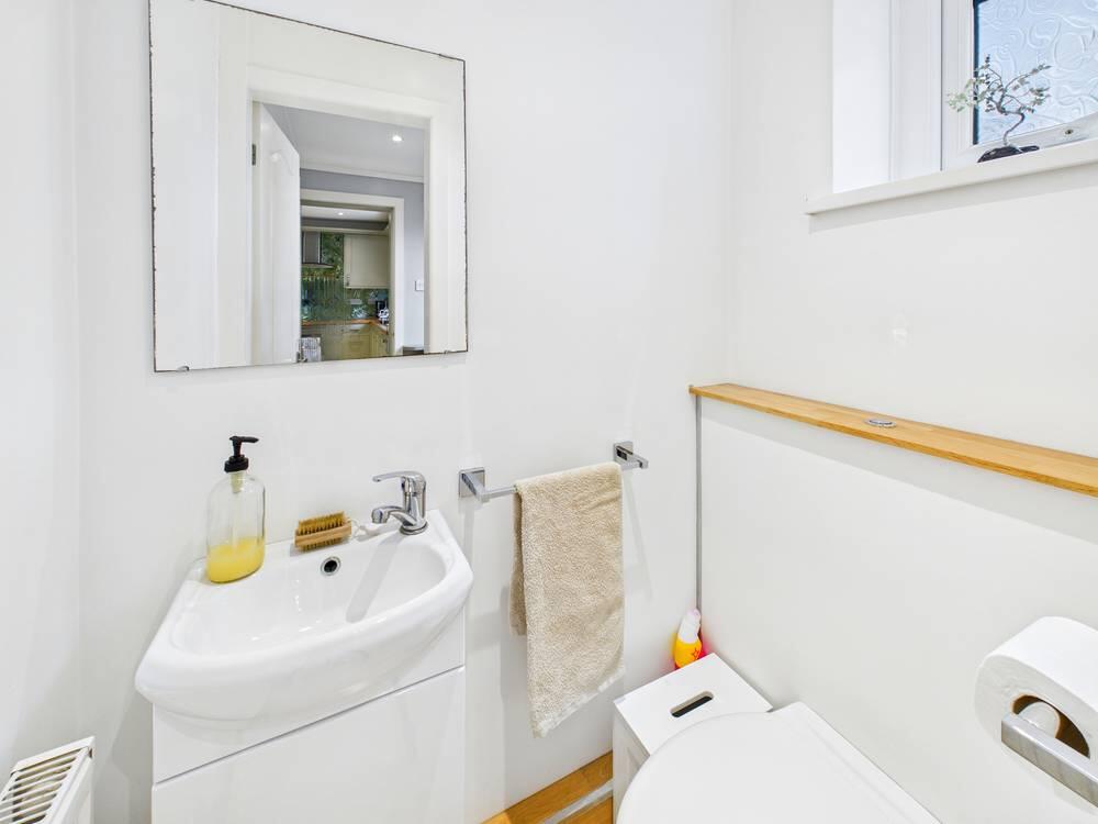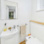 This compact WC features light walls and a wooden floor. It is fitted with a contemporary white basin set into a vanity unit and a toilet. A small window allows in natural light, keeping the space bright and fresh.