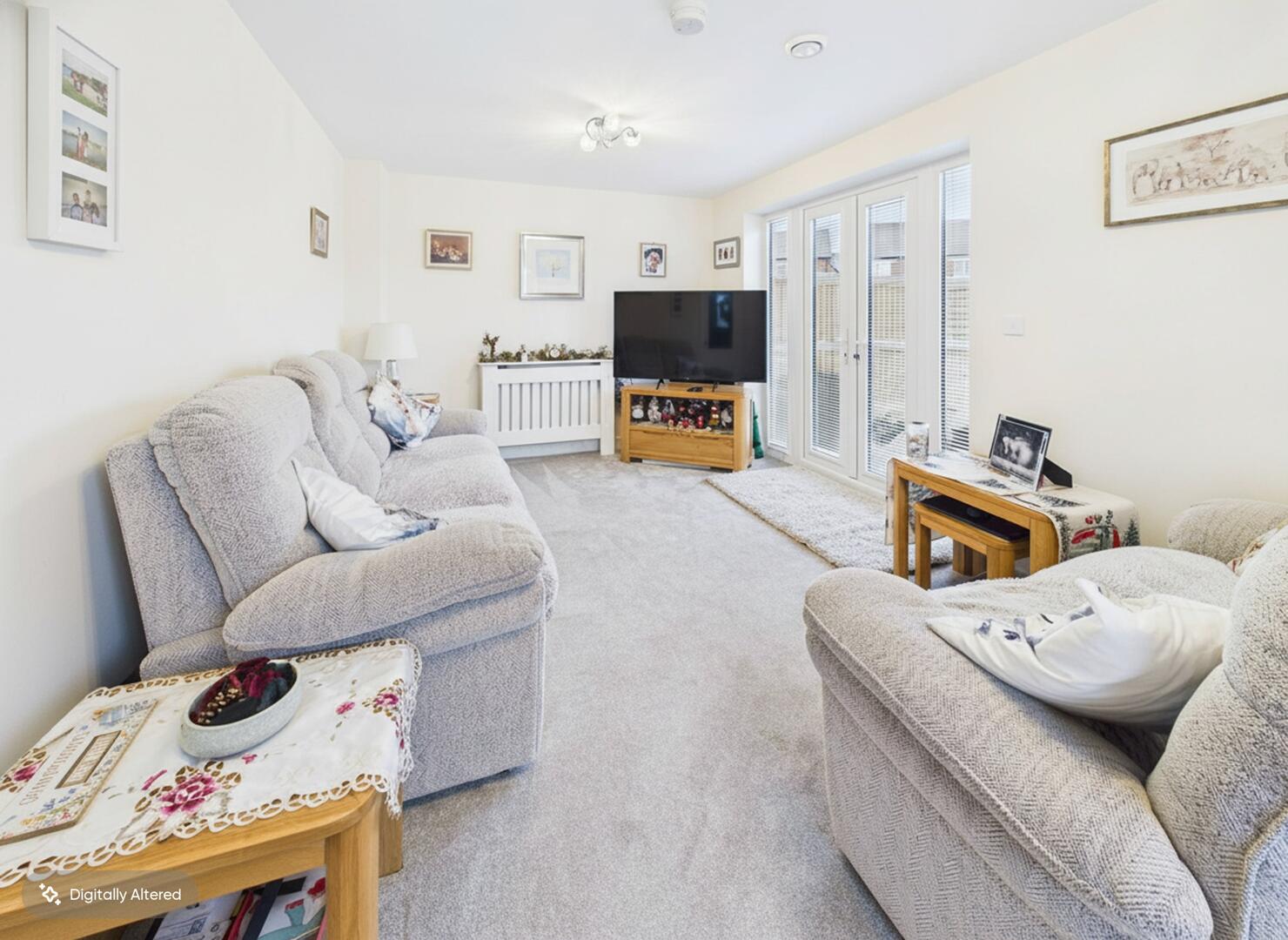 Carpeted throughout. Central heated radiator. UPVC double glazed French doors leading to the rear garden. UPVC window to the front of the property.