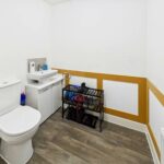 WC with low level flush. Wash hand basin with chrome mixer tap. Extractor fan. Wood effect flooring. Central heated radiator.