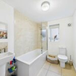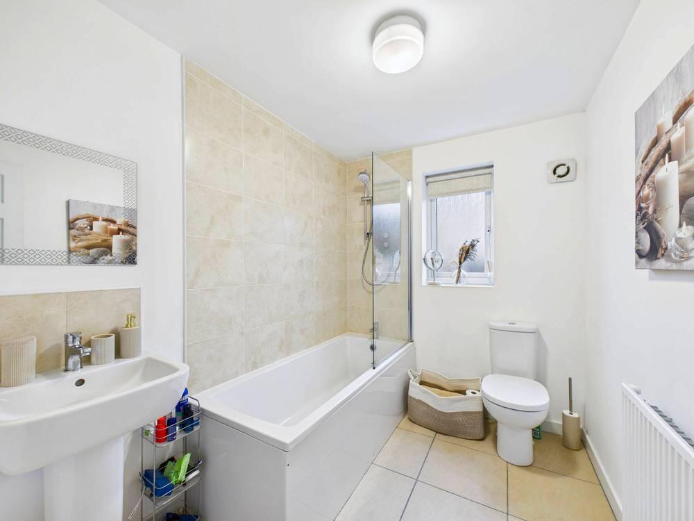 White suite comprising of panel bath with chrome mixer tap, mains feed shower above and glass shower screen. WC with low level flush. Wash hand basin with chrome mixer tap over. Extractor fan. Tiled splash areas. Tiled flooring. Central heated radiator. UPVC double glazed frosted window looking to the rear of the property.
