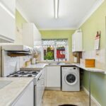 A modern range of white high gloss handle less wall and base units with laminate worktops over incorporating a stainless-steel sink with chrome mixer tap. With a further built-in storage cupboard tiled splash areas wall mounted gas central heating boiler plumbing for an automatic washing machine space for a cooker and fridge freezer. Composite part glazed door leading out to the side of the property UPVC double glazed window looking out to the rear aspect.