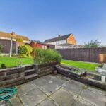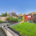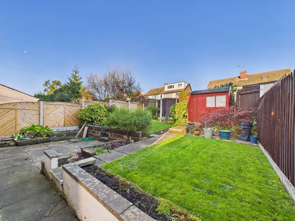 A tiered rear garden with a paved patio area, stepping up to twin lawns boarded by mature flower beds. A useful garden shed sits at the top of the garden.