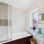 Panel bath with chrome taps and mains feed shower with shower screen. Wash hand basin with chrome taps over. Tiled flooring and walls. UPVC double glazed frosted window to the front elevation.