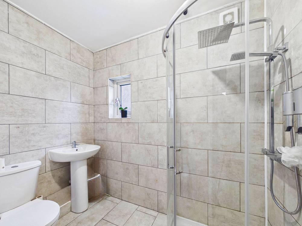 White suite comprising of WC with low level flush. Wash hand basin with chrome mixer tap. Shower cubicle with mains feed shower. Full height wall tiling. Tiled flooring. Chrome central heated towel rail. UPVC double glazed frosted window to the front.