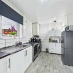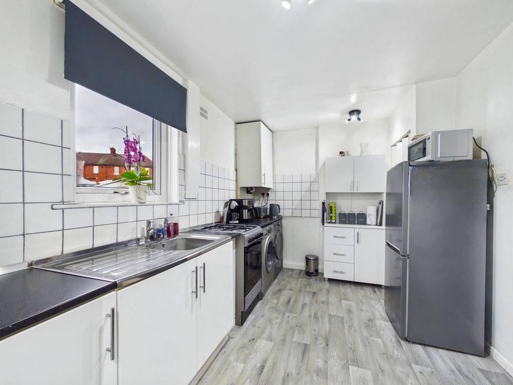 Modern range of kitchen base units. With space for a cooker, fridge/freezer and option to reconnect plumbing for washing machine. Sink with drainer and chrome taps. Access to hallway leading to the WC. Wood effect flooring. Central heated radiator. UPVC double glazed window to the rear.
